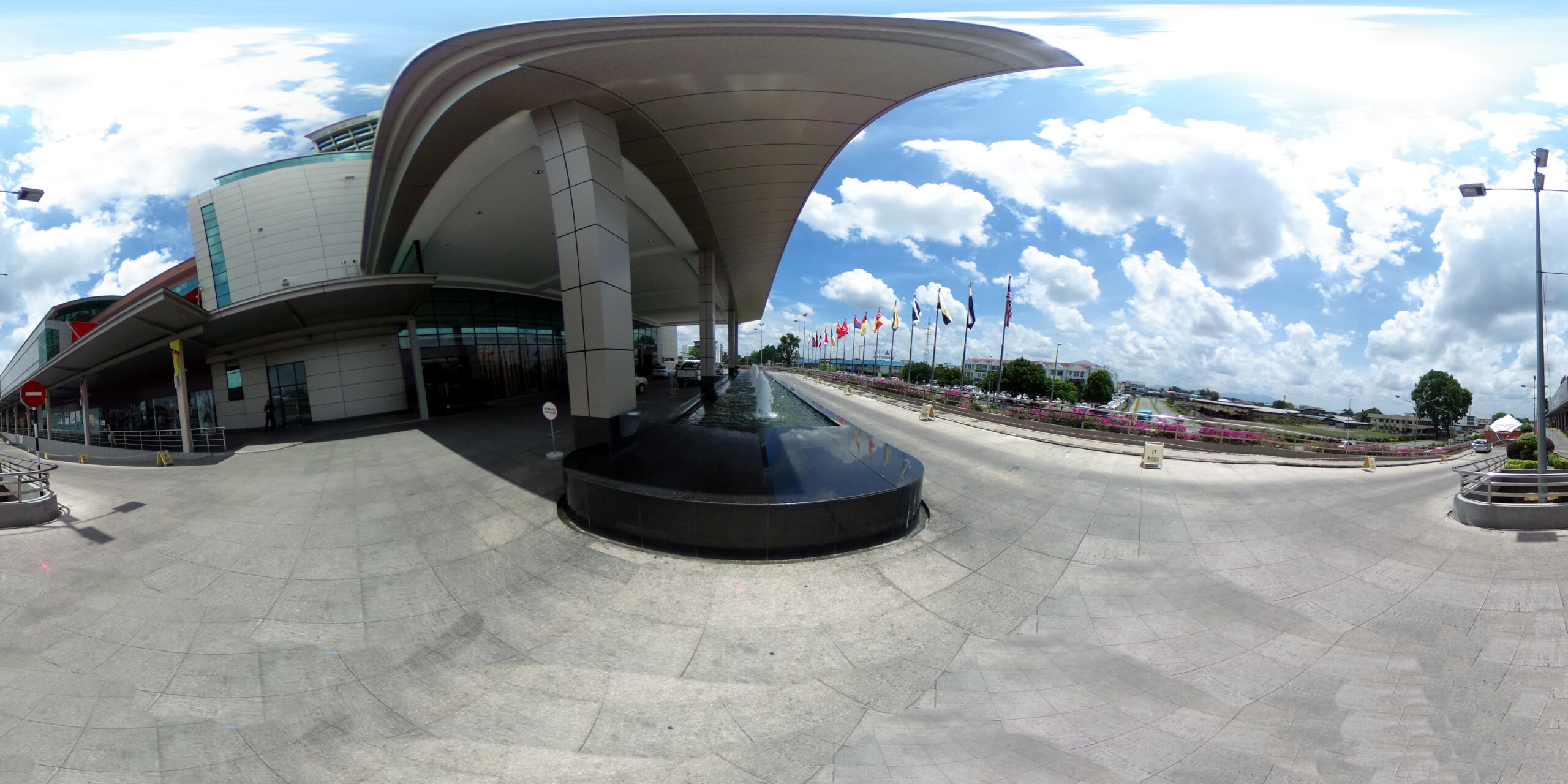 The water features surrounded by pavement for pedestrians and Hotel guest drop off. In front of the features are series of national and state flags. A level below it is the road linking to the entrance of basement car park.